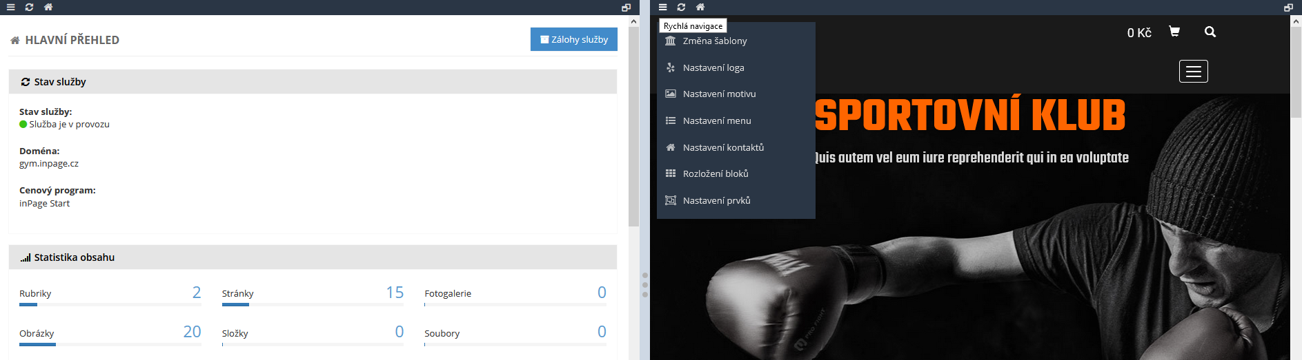 Při prvním spuštění náhledového režimu se vám rozdělí administrace do dvou částí. V jedné z nich máte náhled webu a v té druhé samotné rozhraní administrace, ve kterém provádíte konkrétní úpravy obsahu webových stránek. Defaultní zobrazení lze změnit. K dispozici je i varianta, kdy náhled webu je na celé ploše stránky a editační okno se vám zobrazí vždy po kliknutí na konkrétní prvek.