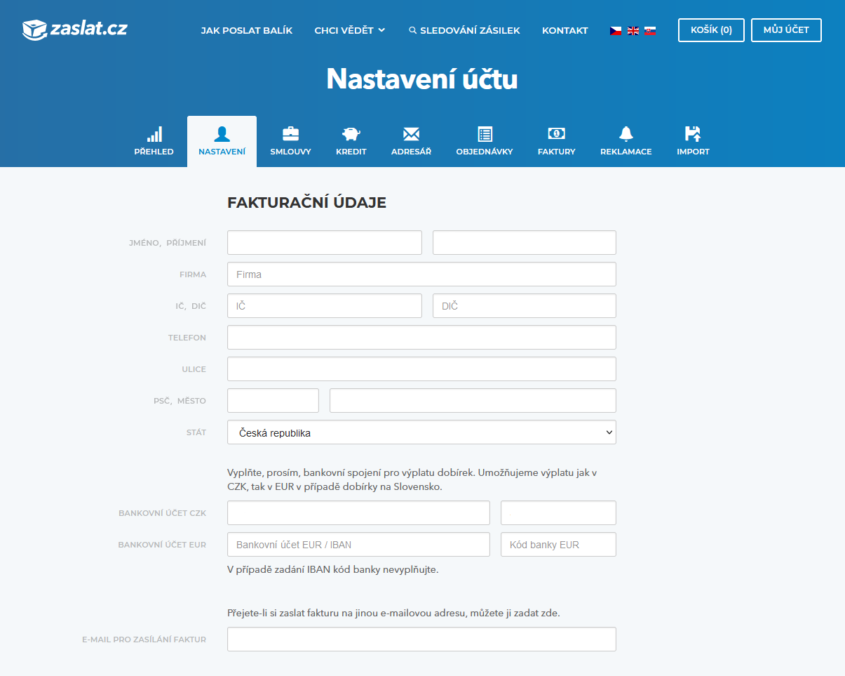 Zkontrolujte a případně doplňte vaše fakturační údaje a proveďte základní nastavení služby, jako je nastavení notifikací a nastavení odběrného místa zásilek.