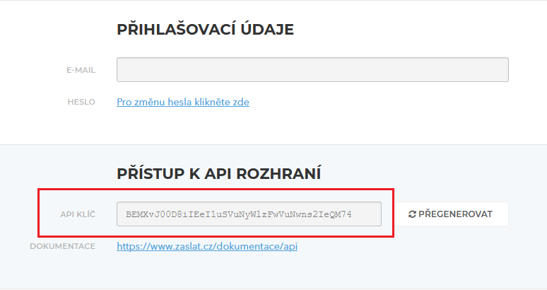 V rozhraní služby Zaslat pod záložkou Nastavení najdete položku Přístup k API rozhraní.