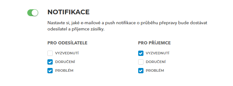 Zde si můžete povolit zasílání notifikací a vybrat, jaké stavy se mají vám i příjemci odesílat.