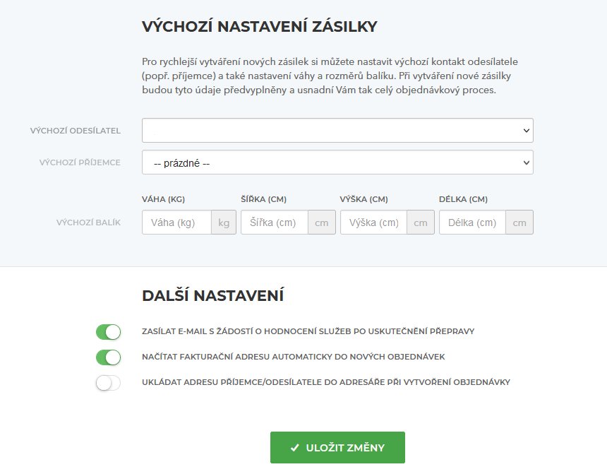 Následně můžete taktéž definovat výchozí velikost a váhu vámi expedovaných balíků (tyto hodnoty budou použity jako výchozí při importu z inPage), a taktéž nastavit notifikace s hodnocením kvality přepravy, případně nastavení automatického vyplňování fakturační adresy a automatického vytváření kontaktů.