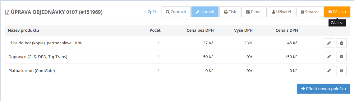 Odbavení zásilky k dopravci Zaslat provedete v editaci objednávky, kde kliknete na položku Zásilka
