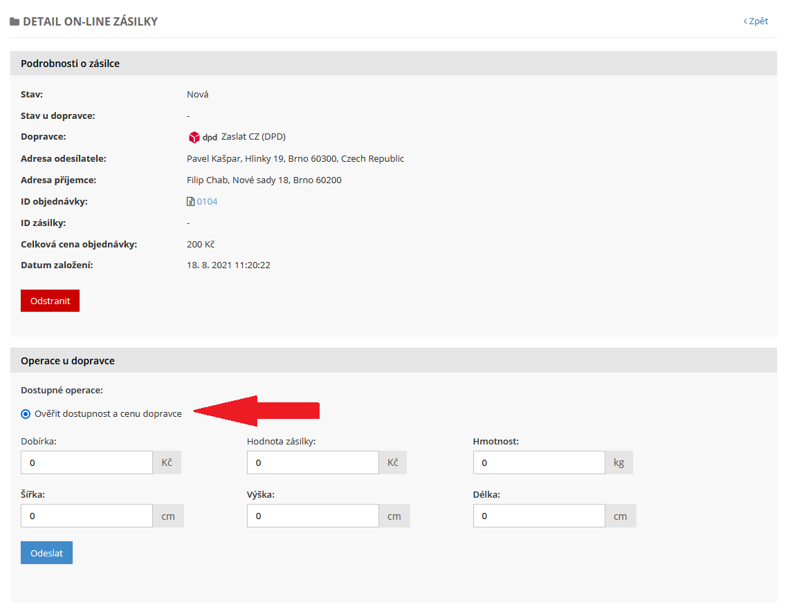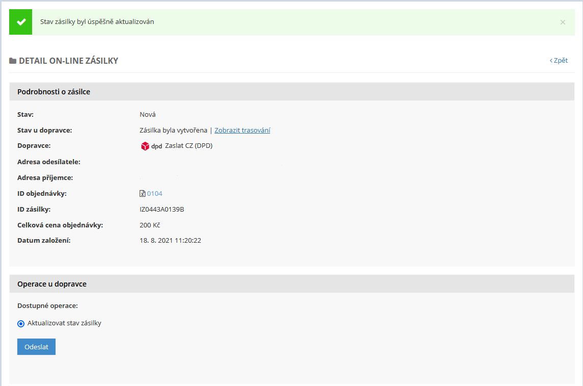 - Potvrdíte odeslání objednávky dopravci kliknutím na tlačítko Odeslat - tím je objednávka přenesena do systému služby Zaslat, která zásilku deleguje vámi vybranému dopravci