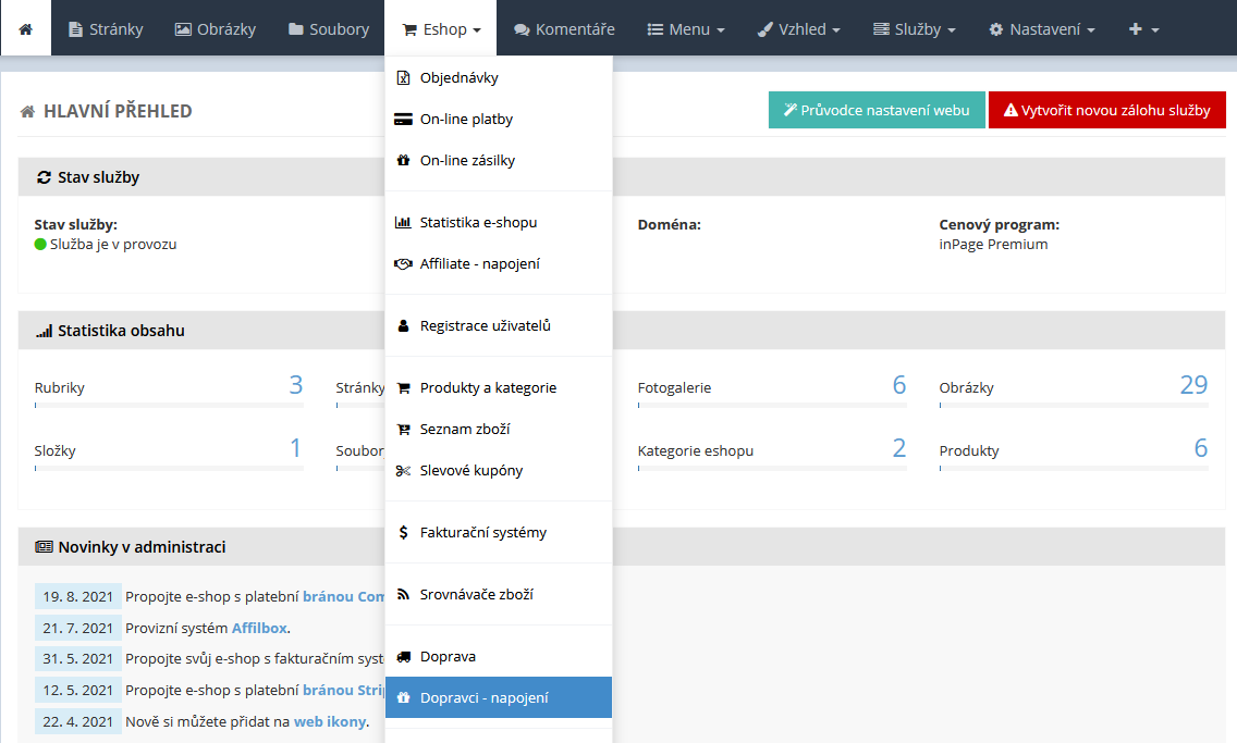 V tuto chvíli máte aktivováno propojení vašeho e-shopu na inPage se službou Zaslat.