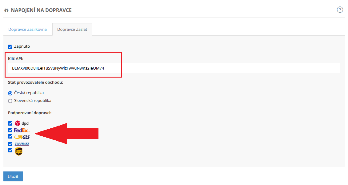 Vyberte možnost Zapnuto a následně do volného pole označeného Klíč API vložte klíč, který jste si zkopírovali v rozhraní služby Zaslat. Následně vyberte konkrétní dopravce, které chcete pro doručování zásilek využívat a vše uložte.