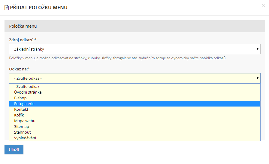 Poté vyberte Odkaz na:, kde se nabídnou další možnosti. Např. při volbě základní stránky můžete vybrat odkaz na úvodní stránku (celého webu), e-shop, fotogalerii (stránka s přehledem všech fotogalerií), atd.