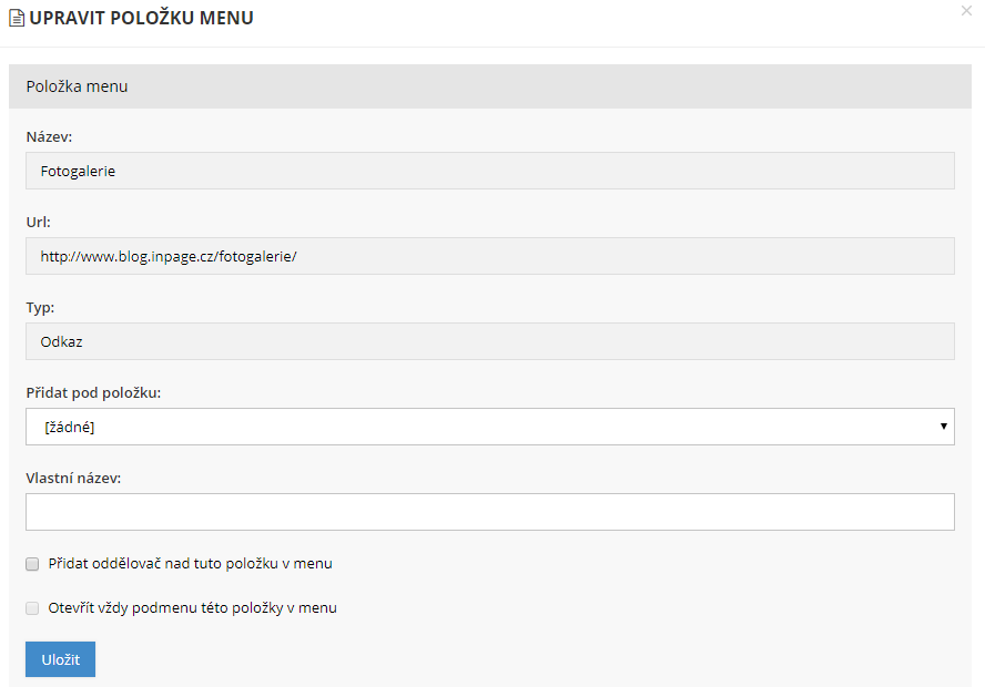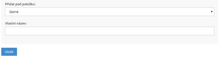 - Přidat pod položku - pro přidání hlavní položky menu, ponechte volbu žádné. V případě submenu vyberte položku, pod kterou bude odkaz zobrazen.