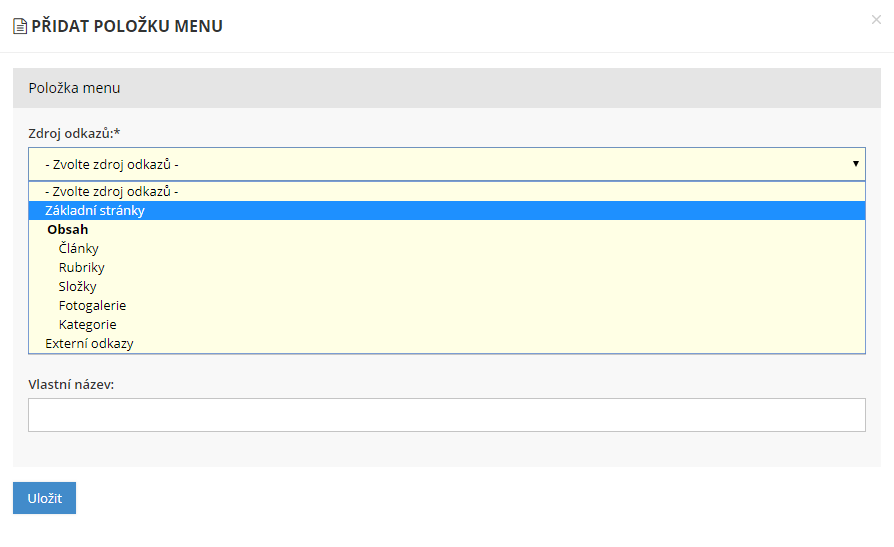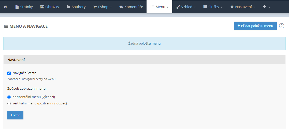 - obsah: články, rubriky, složky souborů, jednotlivé fotogalerie, jednotlivé kategorie e-shopu. Tyto prvky lze do menu nastavit již při jejich vytváření nebo úpravě.