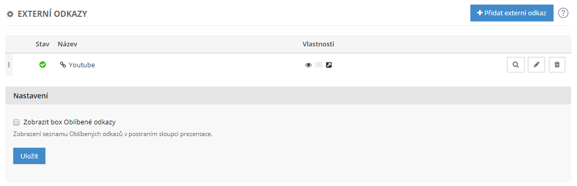 Externí odkazy jsou opět řazeny v seznamu a lze jim přetažením měnit pořadí. Dále vidíte nastavené vlastnosti a vpravo jsou funkční tlačítka pro náhled, úpravu a odstranění odkazu. Pod seznamem odkazů je zaškrtávací pole pro možnost zobrazení boxu Oblíbené odkazy.