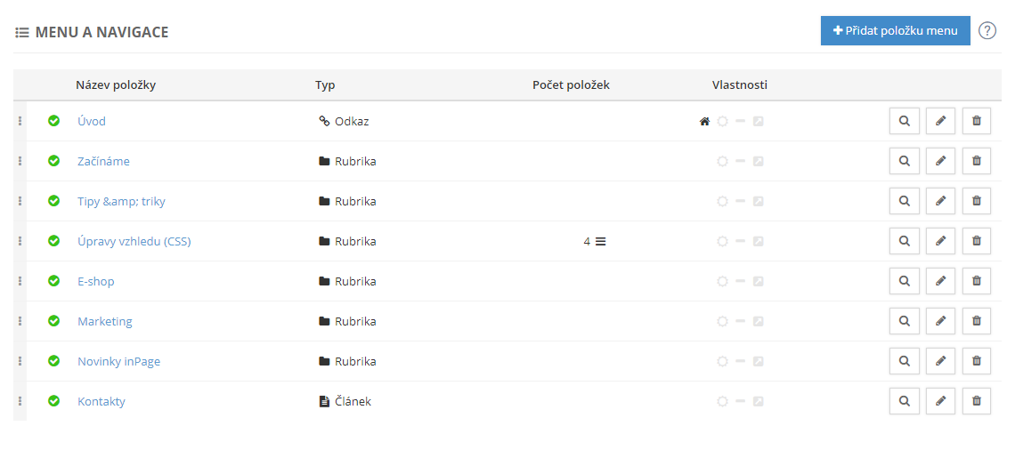Položky jsou řazeny v seznamu pod sebou a můžete je přesouvat uchopením za tři tečky vlevo. U každé položky jsou zobrazeny informace o typu odkazu, počtu položek submenu a vlastnostech. Na konci řádku jsou funkční tlačítka pro náhled, úpravu a odstranění. Položky submenu lze zobrazit kliknutím na název nadřazené položky.