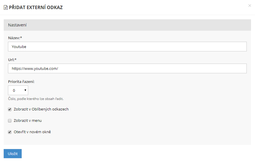 Odkaz přidáte kliknutím na tlačítko Přidat externí odkaz. V zobrazeném okně napíšete název odkazu, vložíte adresu odkazu, v případě potřeby zvolíte prioritu řazení (v jakém pořadí se budou odkazy řadit). Zaškrtnutím políčka Zobrazit v oblíbených odkazech se bude zobrazovat ve stejnojmenném boxu na webu, zaškrtnutím políčka Zobrazit v menu, jej zobrazíte v hlavním menu a zaškrtnutím políčka Otevřít v novém okně, se otevře do nového okna prohlížeče.