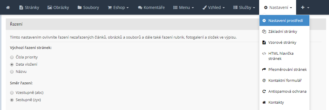 Pokud chcete řadit obsah v administraci i na stránkách podle data vložení, stačí zvolit toto nastavení. Také v tomto případě máte možnost zvolit způsob řazení vzestupně či sestupně.