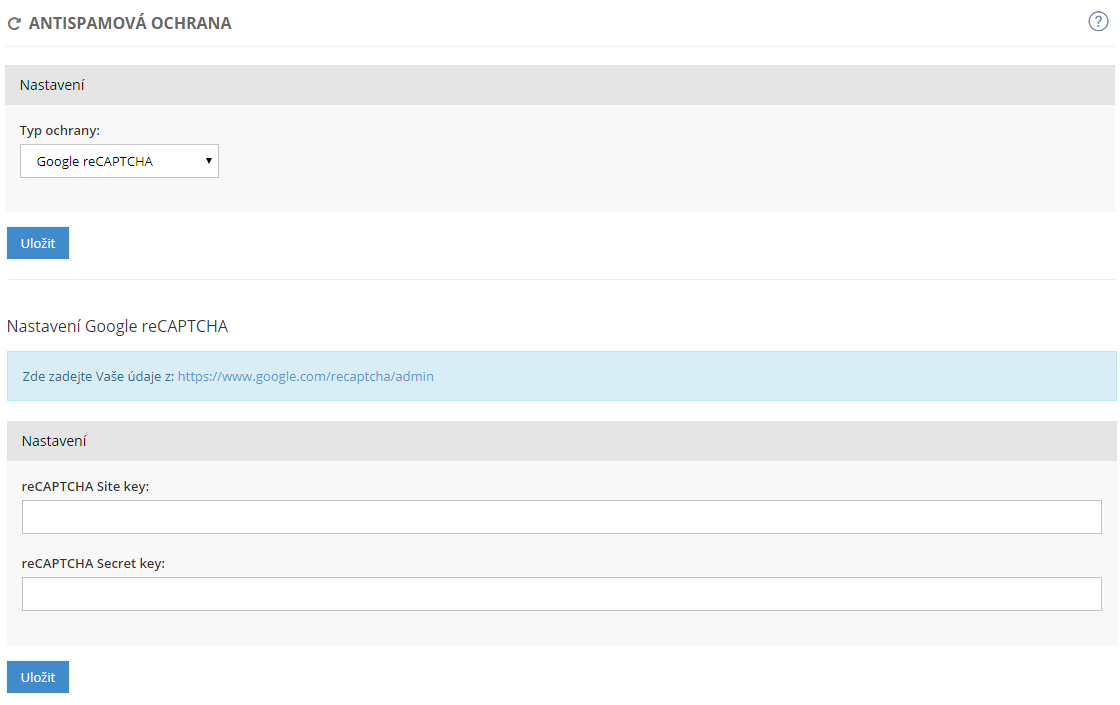 Jedná se o ochranu před roboty spamující prostřednictvím formulářů. K ochraně lze využít vlastní otázky, na kterou musí uživatel před odesláním formuláře odpovědět nebo nastavením Google reCAPTCHA, což je opsání kódu z obrázku. O nastavení reCAPTCHA si přečtěte v článku Nová ochrana před roboty reCAPTCHA.