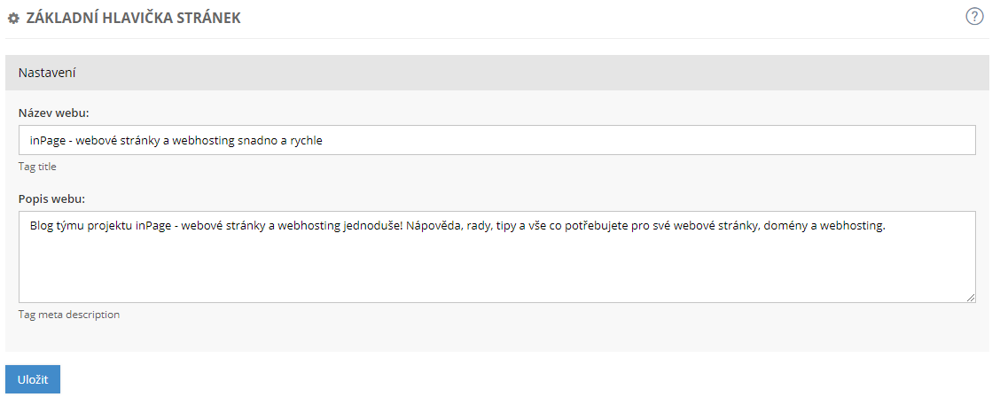V HTML hlavičce můžete vyplnit Název webu a Popis webu. Název se zobrazí v prohlížeči, proto by měl být co nejvýstižnější. Do popisu pak uveďte krátký text o vašich stránkách. Některé vyhledávače mohou tento popis zobrazovat i ve výsledcích vyhledávání. Jedná se o nastavení HTML hlavičky pro celý web, ke kterému se pak automaticky tvoří automatická hlavička pro stránky, rubriky, fotogalerie a další.