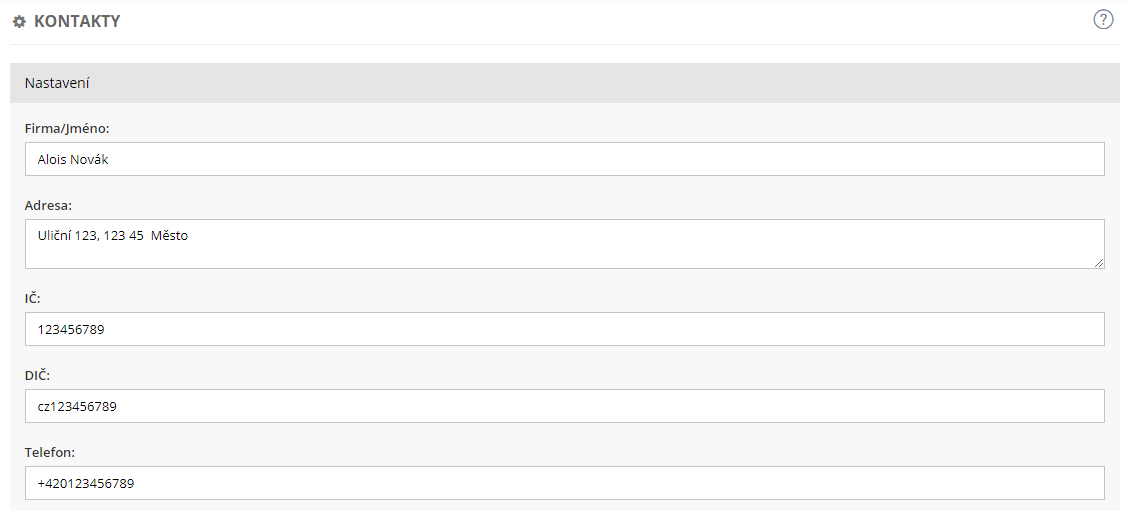 Dále zde můžete nastavit kontaktní údaje, které se budou zobrazovat na webu v nadefinované části dle šablony. Ve formuláři lze vyplnit základní údaje a určit jejich zobrazení.