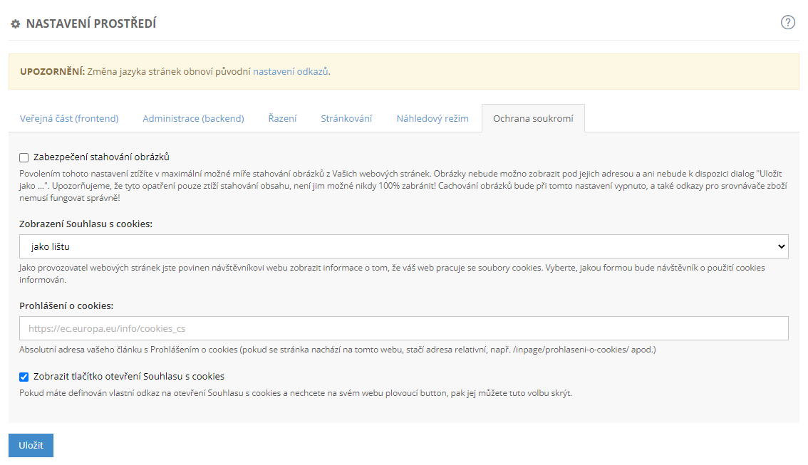 - Zabezpečení stahování obrázků - jedná se o zabezpečení vašich autorských obrázků na webu. Aktivací této volby zabráníte jejich možnému stažení a předejdete tak jejich zneužití či odcizení viz článek Zabezpečení stahování obrázků.