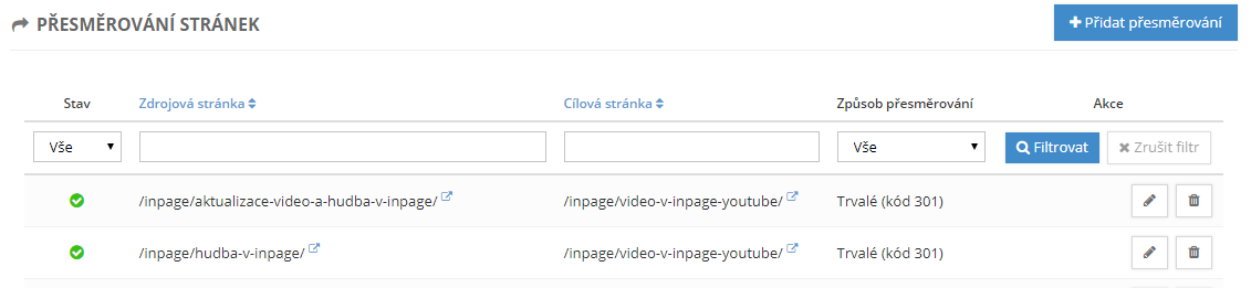 Jedná se o nastavení přesměrování staré URL adresy stránky na novou v rámci webu. Použití této funkce je popsáno v článku Přesměrování URL adres v rámci webu.