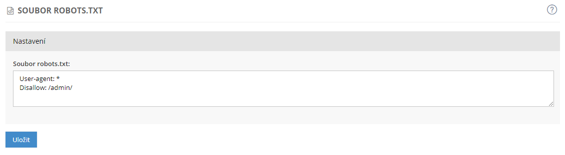Zakazuje nebo povoluje robotům procházení určitých částí webu. Používá se např. k zabránění vyhledávačům v zobrazení stránky ve výsledcích vyhledávání. Jak toto nastavení provést a bližší vysvětlení Robots.txt je popsáno v článku Meta tag "robots" a robots.txt