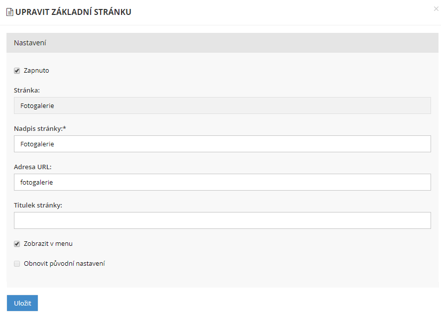 Základní stránky jsou přednastavené odkazy inPage, které lze dále spravovat a upravovat. V seznamu vidíme, zda jsou prvky aktivní nebo nikoliv. Můžete upravit jejich Nadpis stránek, Adresu URL a Titulek stránky. Dále je zde možné nastavit zobrazení menu anebo obnovit jejich původní nastavení.