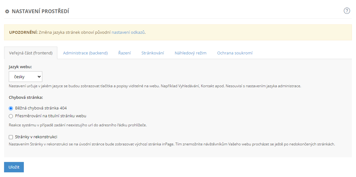 - Stránky v rekonstrukci - V případě nedokončeného webu lze nastavit stránky v rekonstrukci a uživatelům, kteří by navštívili nedokončený web, se zobrazí výchozí stránka inPage.