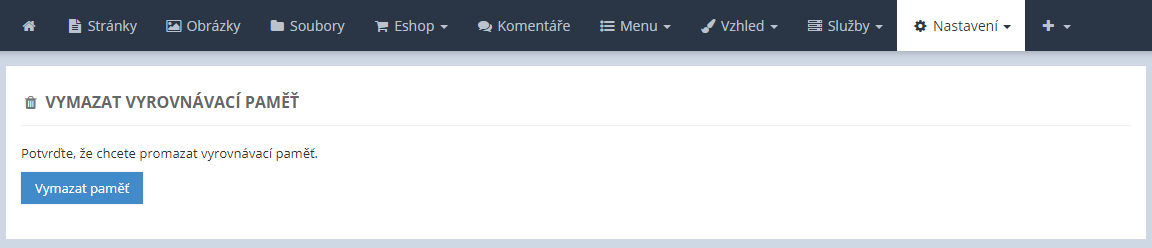 Vyrovnávací paměť pomáhá snížit zatížení a prodlevu při načítání webu. Přijatá data se jednoduše uloží do dočasné paměti a případné další načtení webu je rychlejší. Problém může někdy vzniknout při úpravách webu, kdy přesto že jste nahráli nový obsah na webu vydíte ten původní. Někdy zůstanou stará data uložena ve vyrovnávací paměti. Pro tyto případy je v administraci tato funkce, která vymaže data vyrovnávací paměti viz Vymazání vyrovnávací paměti.