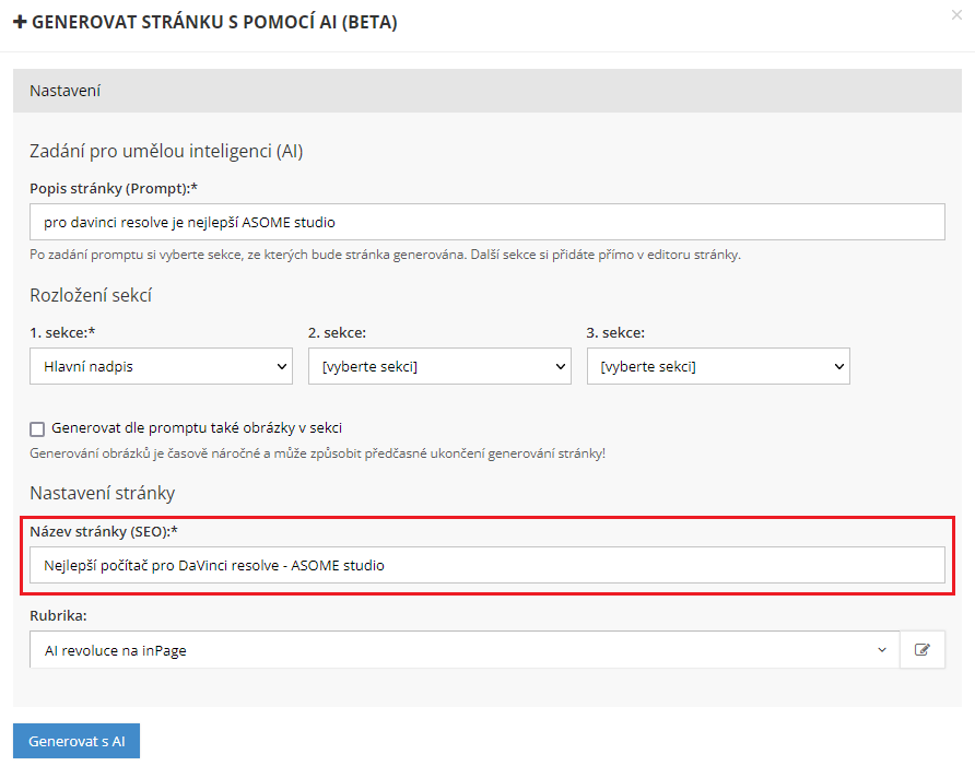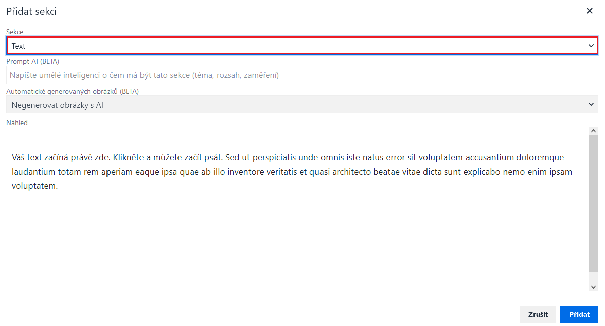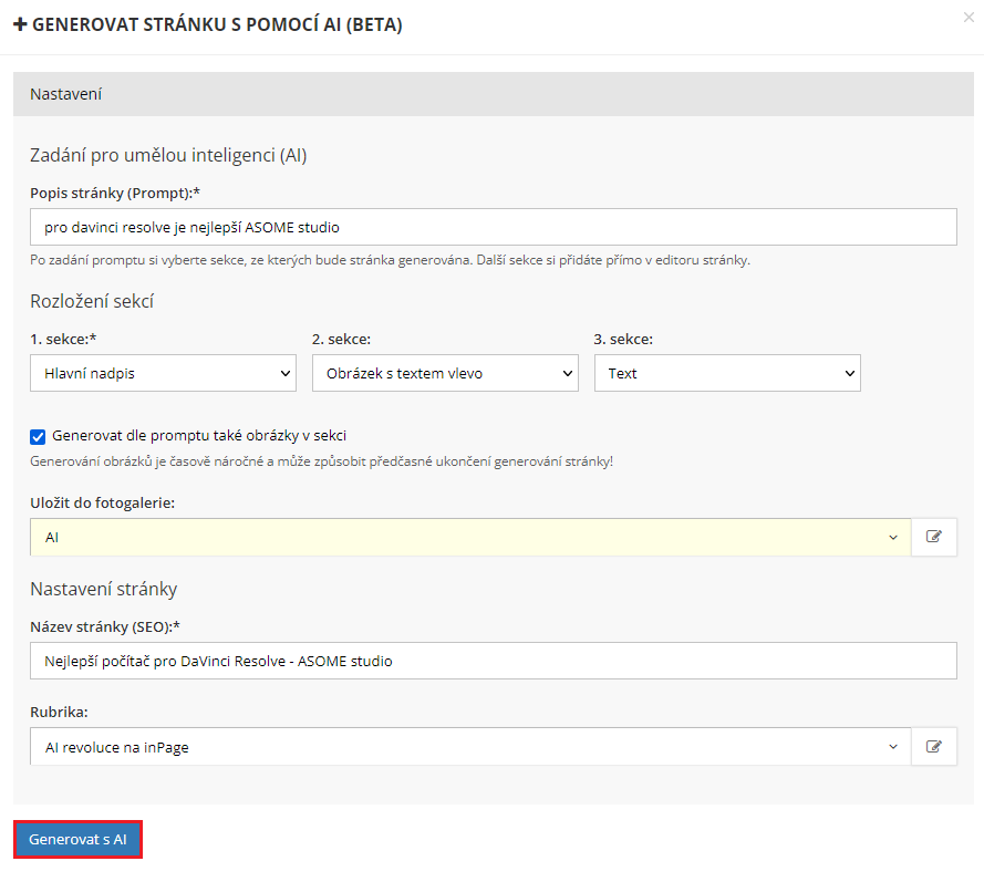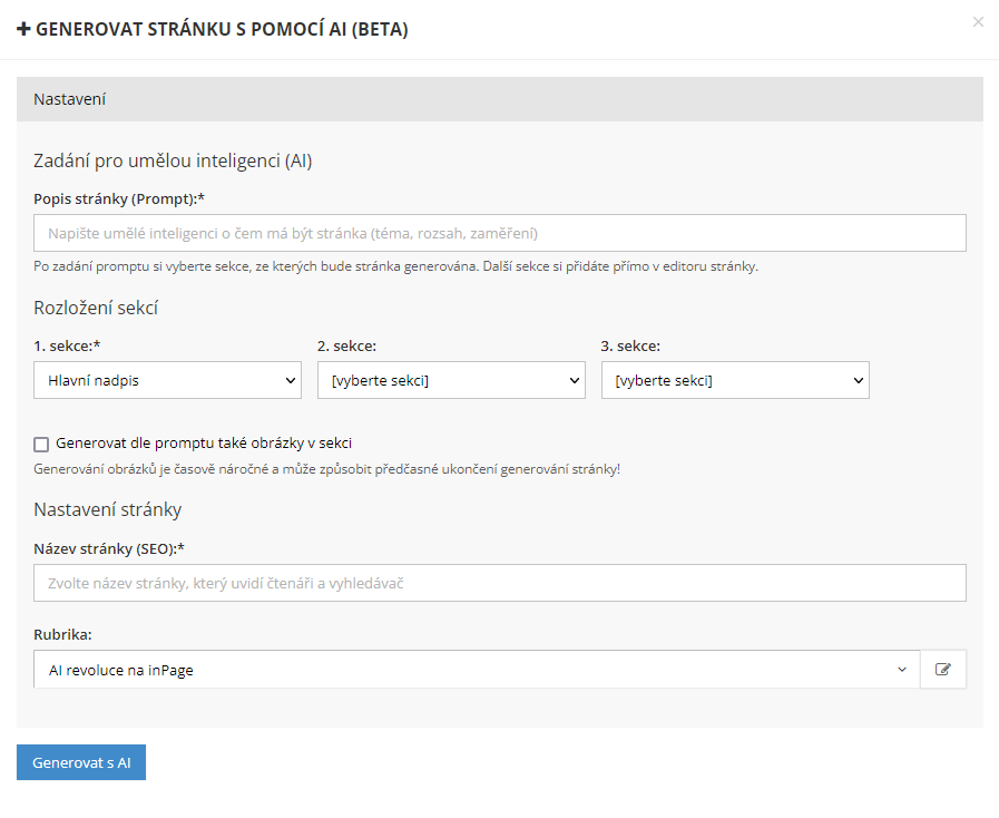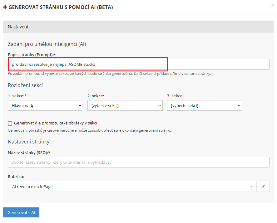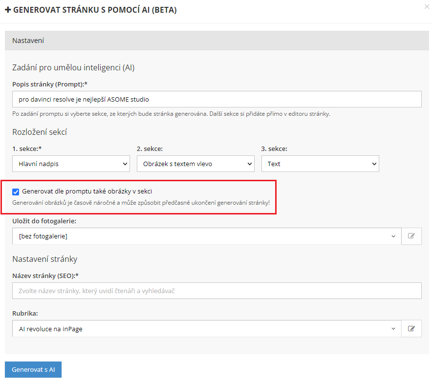 Postrádám možnost generování textů AI do perexu obrázků a galerií.