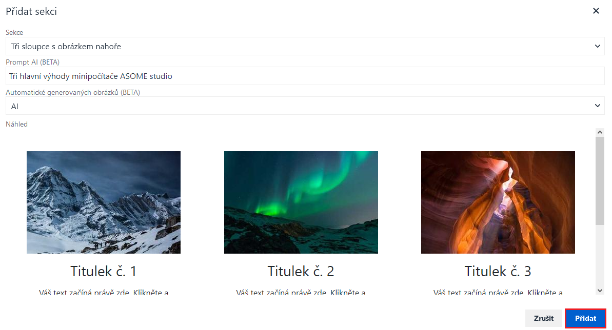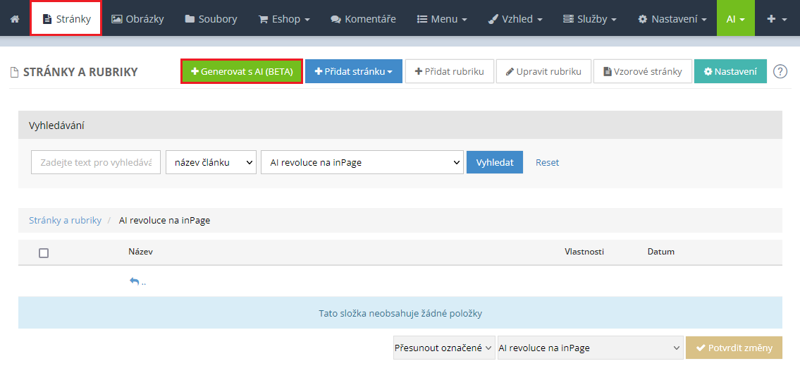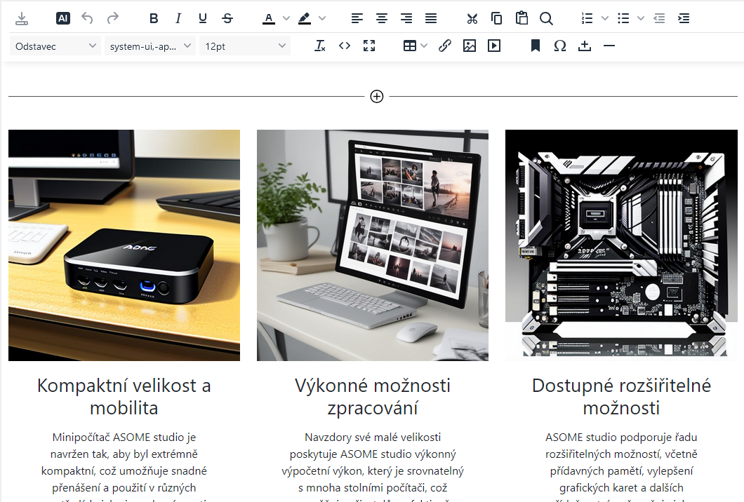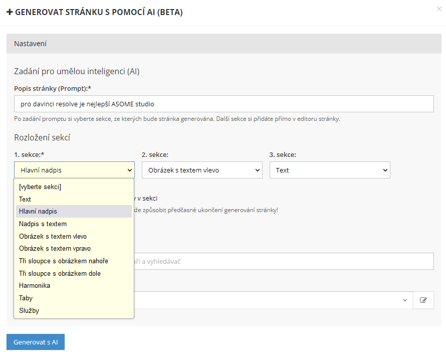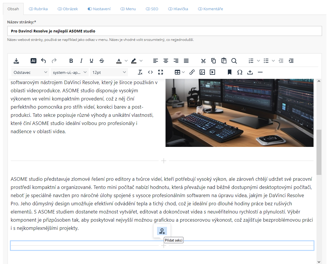 Postrádám možnost generování textů AI do perexu obrázků a galerií.
