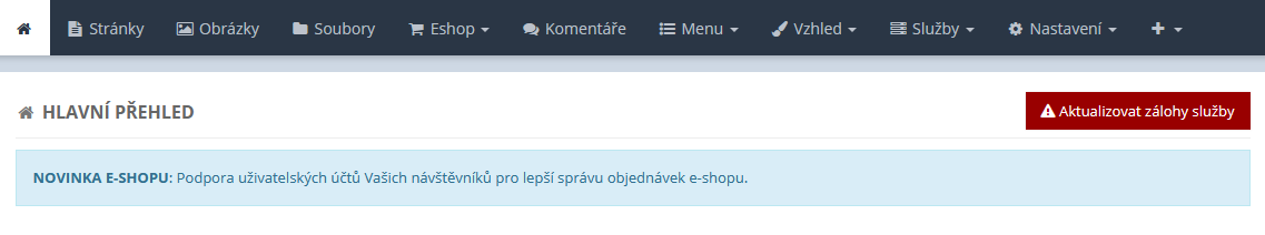 Pokud jsou zálohy webových stránek neaktuální, zobrazí se vám upozornění na úvodní stránce webové administrace. Poté co si vytvoříte zálohu webu, tak upozornění zmizí.