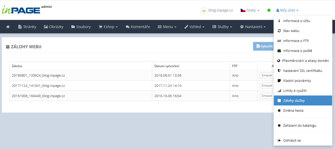 V případě komplexních úprav webu je vhodné ještě před úpravami provést zálohu webu. Tyto zálohy se vytváří v administraci inPage v části Můj účet → Záloha služby po stisknutí tlačítka Vytvořit zálohu. Zálohy mohou být maximálně tři.