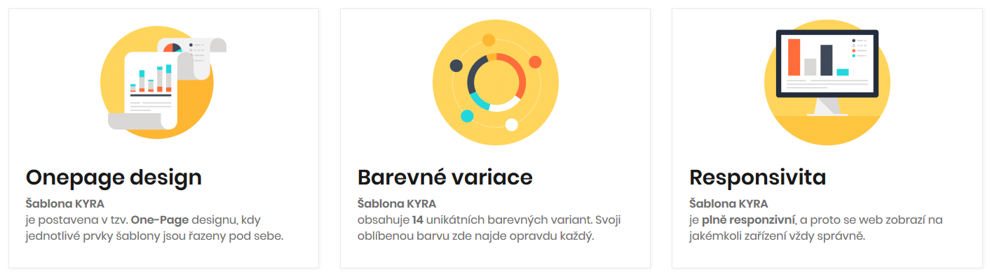 Šablona KYRA nabízí rekordní počet barevných variant. Ne pět, ne deset ale rovnou čtrnáct barevných kombinací. Jedná se o barevné varianty, kdy polovina z nich používá základní barvu žlutou a druhá polovina základní barvu černou.
