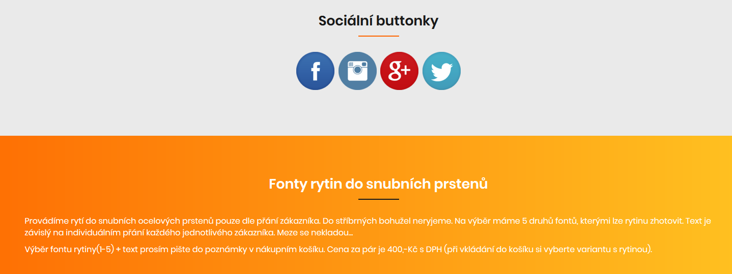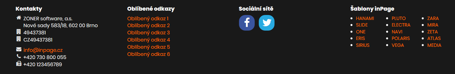 Patička v nové šabloně KYRA obsahuje 4 samostatné prvky. Do jednoho se generují kontaktní údaje, do druhého oblíbené odkazy, do třetího odkazy na sociální sítě a do čtvrtého si můžete odkázat libovolnou stránku.