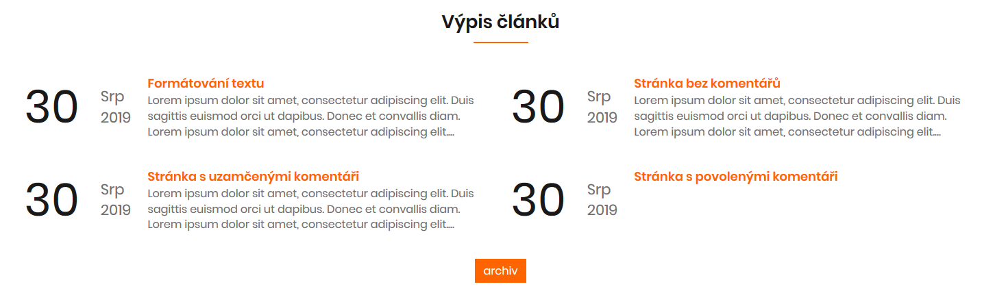 Novinkou je taktéž blokový výpis článků, rubrik, souborů, galerií a produktů. Tyto jednotlivé prvky jsou řazeny do bloku na jeden řádek.