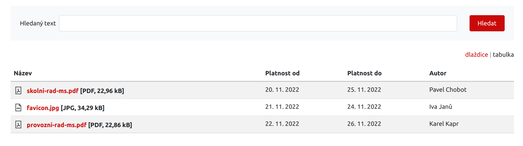Žádné z polí není povinné, ale pokud zadáte jedno datum platnosti, musíte zadat i pole druhé a datum platnosti od musí být časově menší než do. Pole autor není nijak omezeno, očekává se ale, že tam bude zadáno jméno a příjmení osoby, která soubor zveřejnila.