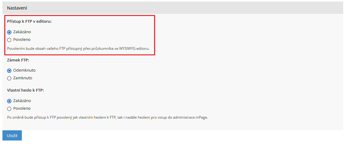 Abyste mohli zobrazit soubory z FTP v editoru, je nutné si aktivovat možnost Přístup k FTP v editoru.