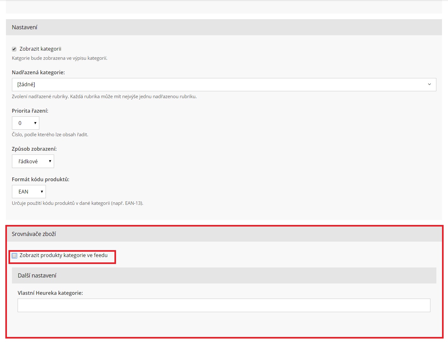 V úpravě jednotlivé kategorie nebo podkategorie v okně Srovnávače zboží stačí odkliknout políčko Eshop -> Produkty kategorie (podkategorie) ve feedu. Změny poté uložte.