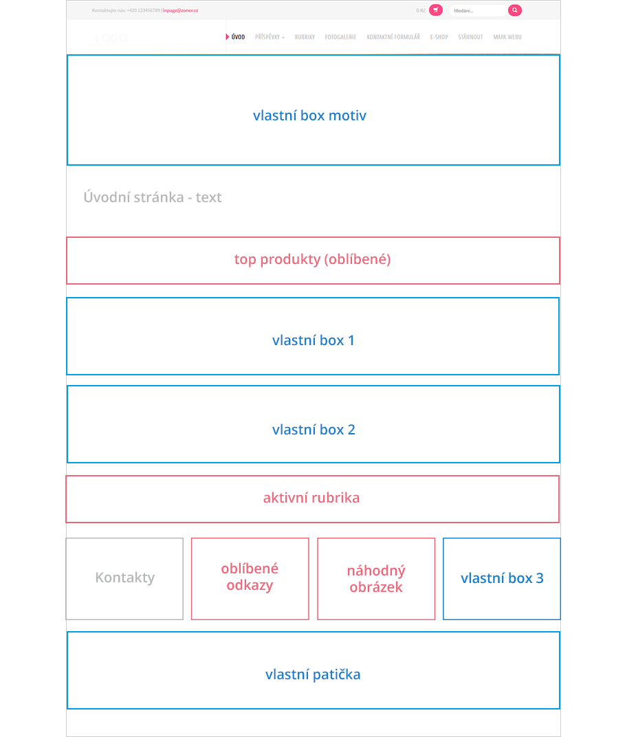 Pro one-page web se skvěle hodí inPage šablona Hanami. Na obrázku vpravo vidíte rozložení prvků stránky u šablony Hanami. Pro vytvoření one-page webu vám bude stačit, když do těchto prvků správně vložíte obsah.