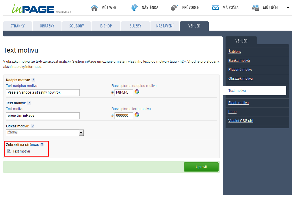 Pokud chcete mít přes motiv napsaný text, například "Veselé Vánoce", můžete k tomu využít funkci Text motivu přímo v administraci Vašich stránek. Jedná se o jednoduchý nástroj, kterým zobrazíte nadpis a popis vašich stránek přesně tam, kde se má zobrazit.