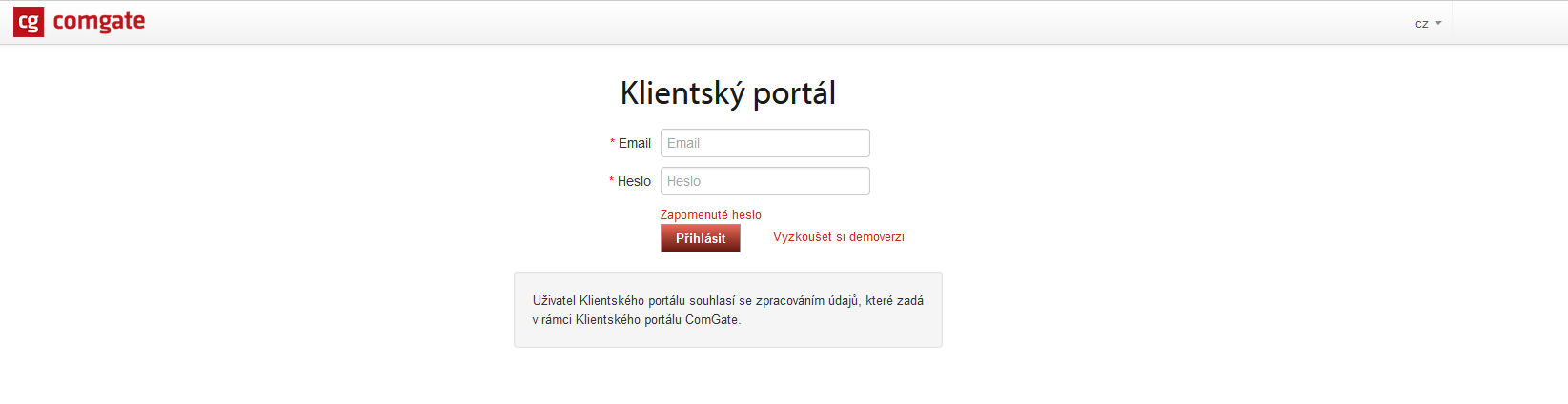 Poté, co domluvíte s podporou brány Comgate podmínky zprovoznění brány, bude vám vytvořen klientský účet a zašlou vám přístupy do klientského portálu brány Comgate, které se nachází na adrese portal.comgate.cz.
