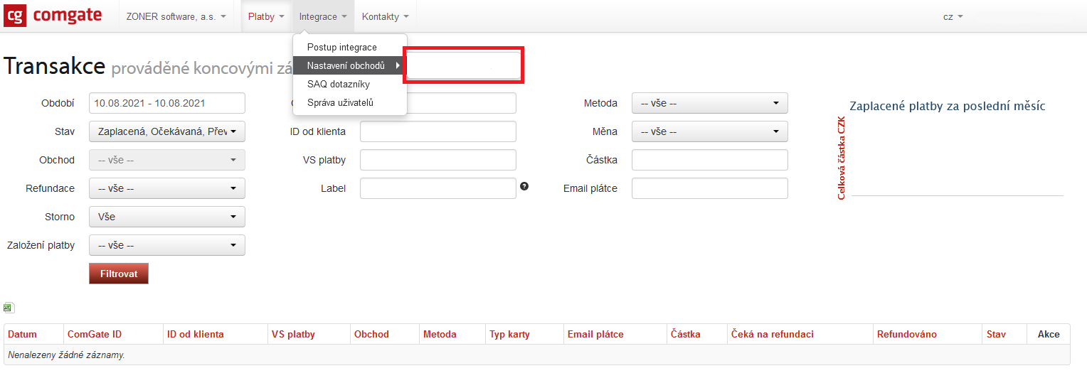 Na úvodní stránce máte přehled proběhnuvších plateb a možnost upravit nastavení účtu, Pokud máte pod daným účtem registrovaných vícero e-shopů, tak zde můžete mezi nimi jednoduše přepínat a upravovat nastavení služeb. S nastavením rozhraní Comgate vám ráda pomůže zákaznická podpora poskytovatele platební brány, tak ji neváhejte v případě potřeby kontaktovat.