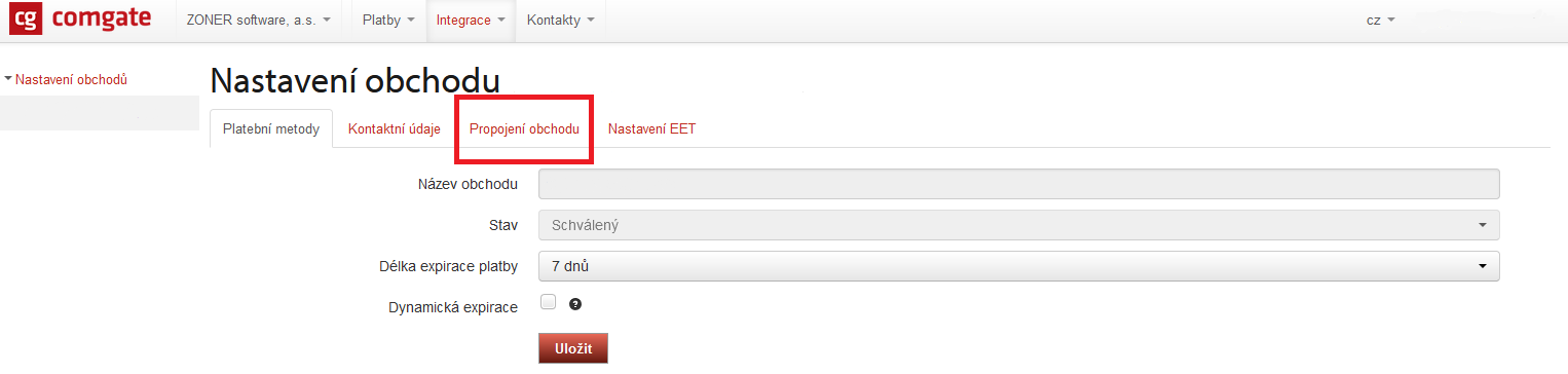 Doplňte název vašeho obchodu, a zvolte si délku expirace plateb. Následně vše uložte. Nyní se vám obchod zobrazí v přehledu a můžete přejít k samotnému propojení platební brány s vašim e-shopem.