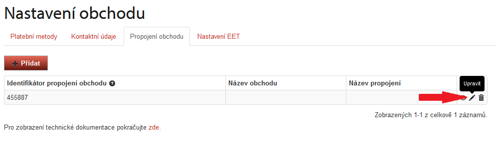V přehledu vidíte ID vašeho e-shopu a jeho samotný název, následně po pravé straně jsou ikony pro možnost zobrazení, smazání a úpravy nastavení. Klikněte tedy na ikonu Upravit.