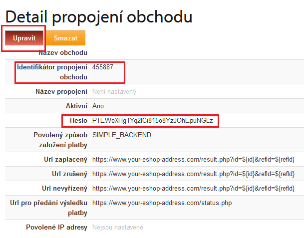 Zde se vám zobrazí informace potřebné k propojení platební brány s vašim e-shopem. Jedná se o údaje Identifikátor propojení obchodu a Heslo.