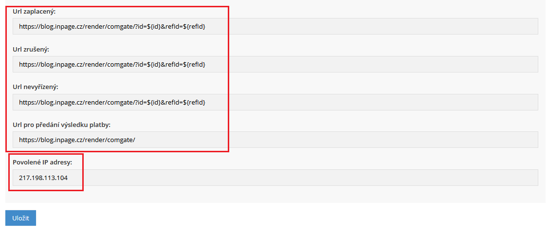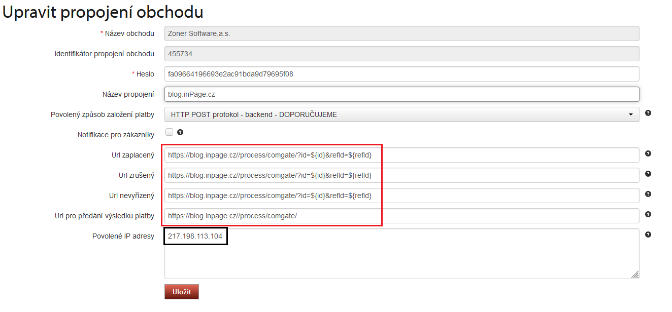 Povolená IP odpovídá IP adrese serveru, na které běží váš e-shop a pro fungování platební brány je nutné tuto položku doplnit. Veškeré nastavení uložte.
