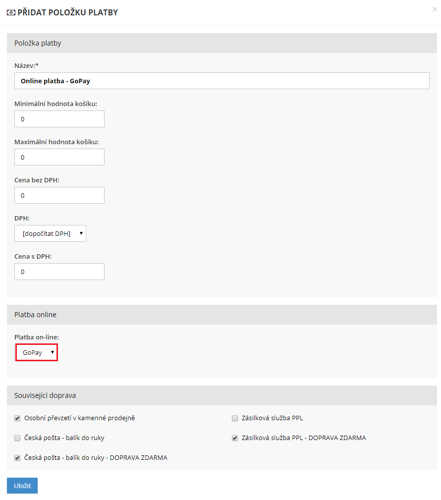V administraci inPage v sekci E-shop → Platba si vytvořte položku např. On-line platba GoPay, a v Platba on-line vyberte volbu GoPay.