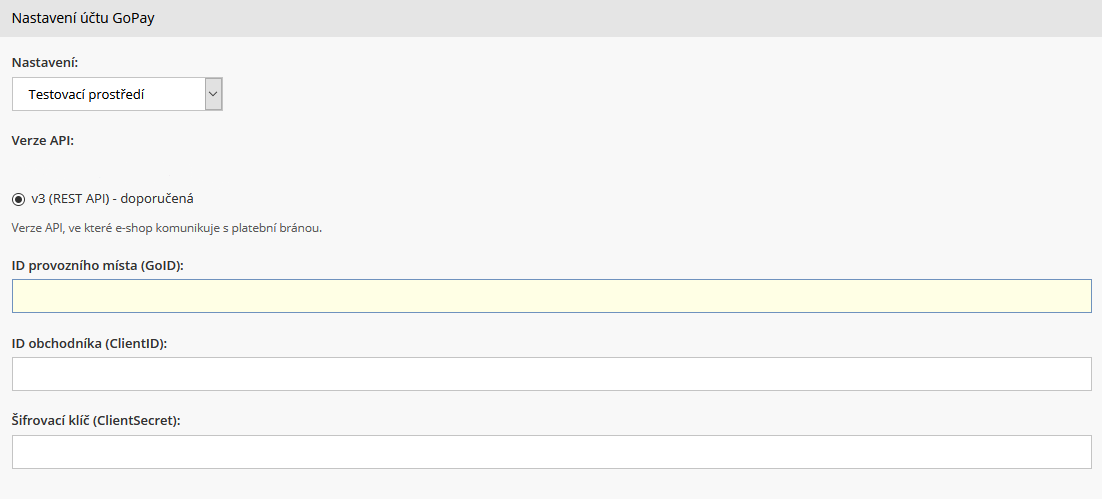 Prvním důležitým krokem je provedení testovacích plateb v testovacím režimu brány, kdy si GoPay ověří, že váš e-shop "umí" komunikovat s jejich bránou. Ke komunikaci mezi e-shopem a platební bránou slouží API. Pro integraci platební brány GoPay do e-shopu na inPage je třeba poskytovateli platební brány sdělit, že pro integraci budete využívat Rest API. Následně Vám poskytovatel platební brány předá testovací přístupy pro integraci: GoID, ClientID, ClientSecret.