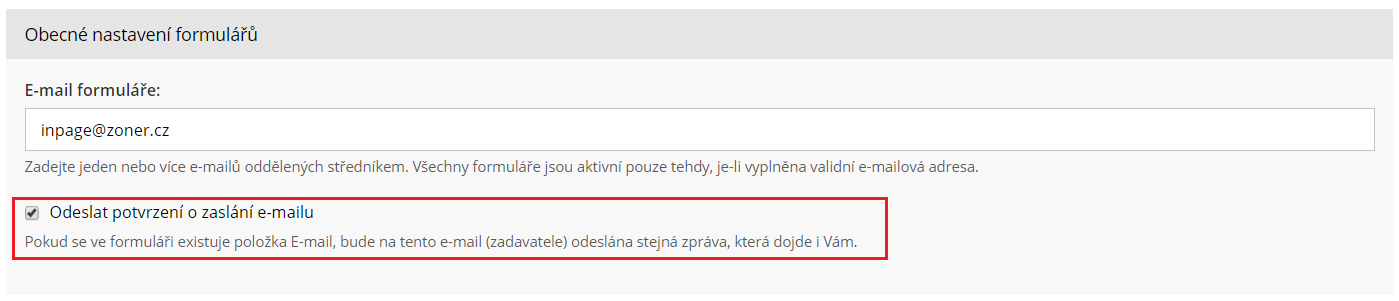 Potvrzení o odeslání aktivujte v sekci Nastavení → Formuláře v části Obecné nastavení formulářů zaškrtnutím políčka Odeslat potvrzení o zaslání e-mailu a uložením změny.