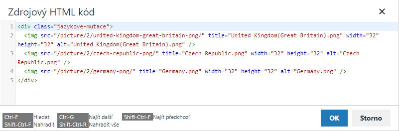 2. Jakmile máte všechny vlaječky vloženy, klikněte na ikonku <> (Zdrojový kód). Zobrazí se vám kódový zápis vložených obrázků. Tento zápis zapouzdříme do tagu <div> s identifikátorem "jazykova-mutace". Prakticky to znamená, že na začátek vložíme kód <div id="jazykova-mutace"> a na konci tento párový tag uzavřeme pomocí </div>. Poté potvrdíme OK.