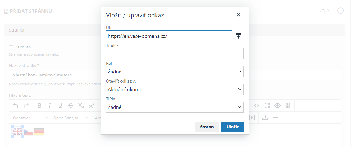 3. Nyní jednotlivým obrázkům vlaječek přiřaďte odkaz (URL adresu) na konkrétní stránku jazykové mutace. Nezapomeňte změnu uložit.