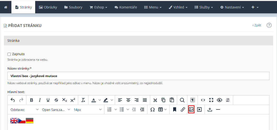 1. Opět je třeba vložit obrázky vlaječek do administrace vašeho webu. Jakmile jsou obrázky nahrány, přejděte do sekce Stránky. Zde vytvořte pomocí odkazu Přidat stránku novou stránku. Název stránky zvolte libovolně. Například "Vlastní box + jazyková mutace". Do obsahu této stránky vložte vlaječky, které jste si nahráli do databáze obrázků. Libovolný obrázek do obsahu stránky vložíte prostřednictvím ikonky s obrázkem (Vložit / upravit obrázek). Nachází se ve spodní částí ikonek napravo.