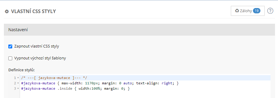 5. Potřebné definice CSS zápisů, si zkopírujte ze samostatného článku. V něm jsou vypsány všechny CSS zápisy k jednotlivým šablonám. Vyberte CSS pro vaši šablonu a vložte jej do vlastního CSS stylu v administraci inPage v sekci Vzhled → Vlastní styly CSS. Aby byl váš styl funkční, zaškrtněte pole Zapnout vlastní styly CSS a dejte tlačítko Uložit.